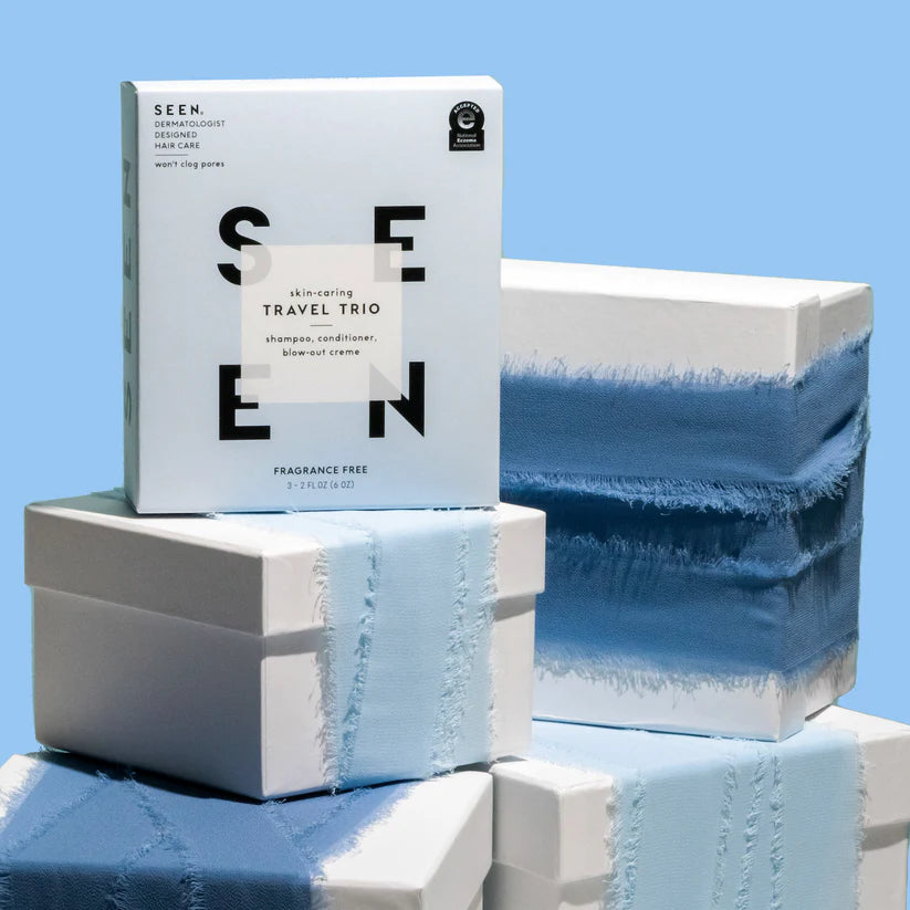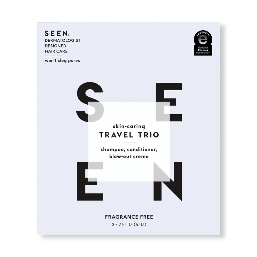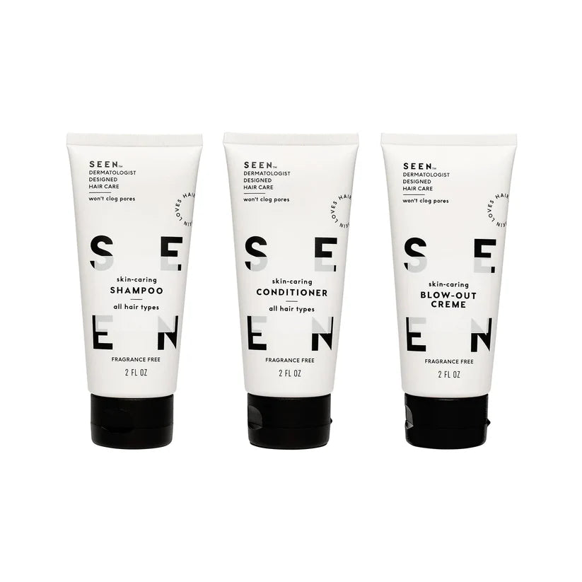 • TSA-approved mini-sizes of SEEN’s fragrance-free Shampoo, Conditioner, and Blow-Out Creme for stronger, smoother, healthier hair