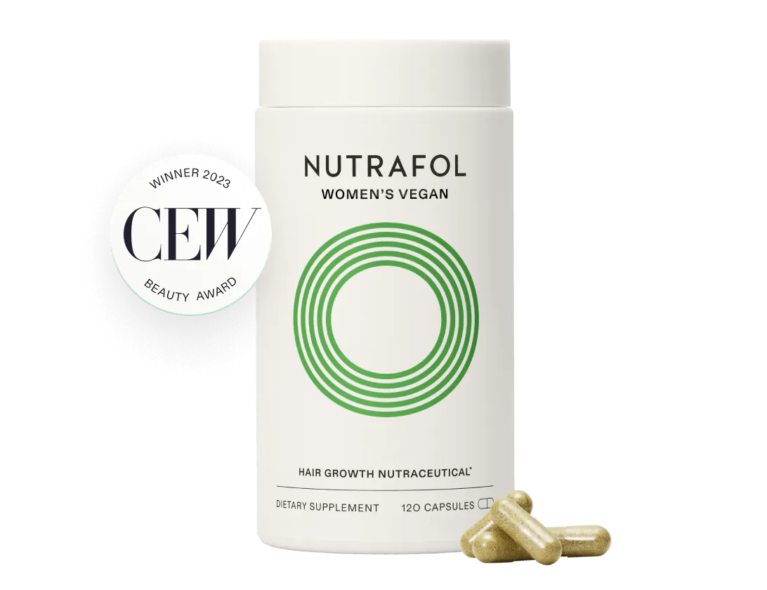 Our daily hair growth supplement is made for women 18-44 with a plant-based lifestyle who are experiencing signs of hair thinning. Physician-formulated with 100% vegan ingredients to target root causes of thinning such as stress, nutrition, and metabolism. This formula results in faster-growing, visibly thicker, stronger hair and is an effortless addition to your daily wellness routine: 4 pills, 1 easy step, all the results.