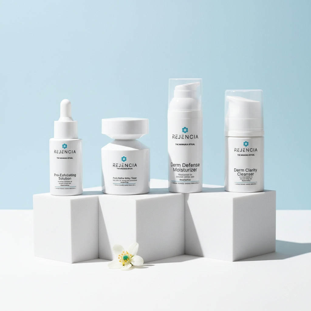 The Rejencia Blemish Kit is a complete skincare routine developed for blemish-prone and acne-prone skin. It supports skin clarity by helping to rebalance excess sebum, refine the appearance of pores, calm visible redness and maintain a healthy skin barrier.
