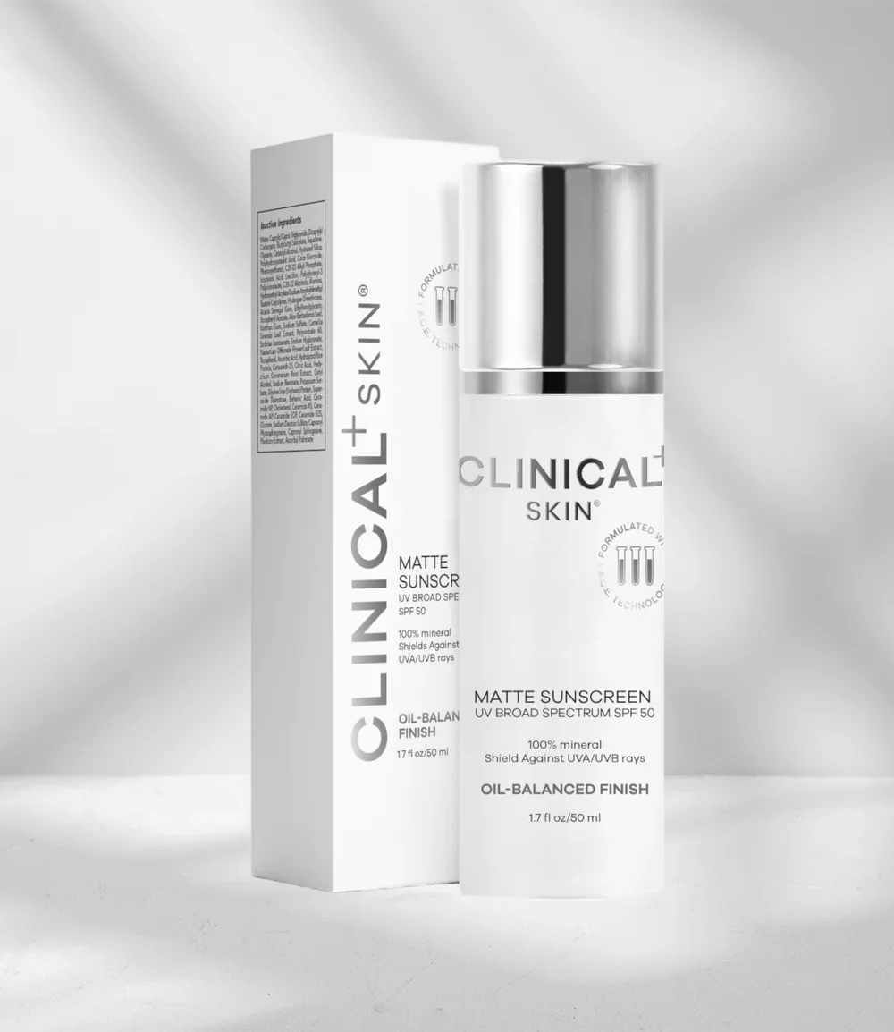 Clinical Skin Matte UV Broad-Spectrum SPF 50 is a dermatologist-tested 100% mineral sunscreen that forms a feather-light shield against damaging UVA and UVB rays - all while achieving an oil-balanced finish. Active ingredients transparent Zinc Oxide and Titanium Oxide work with Vitamin C and Niacinamide to protect, visibly repair, and soothe all skin types. Non-comedogenic and sweat-sponging, this formula blends ultra-sheer, smooths skin's texture, and reduces the appearance of redness and pores for a healthy-looking complexion.