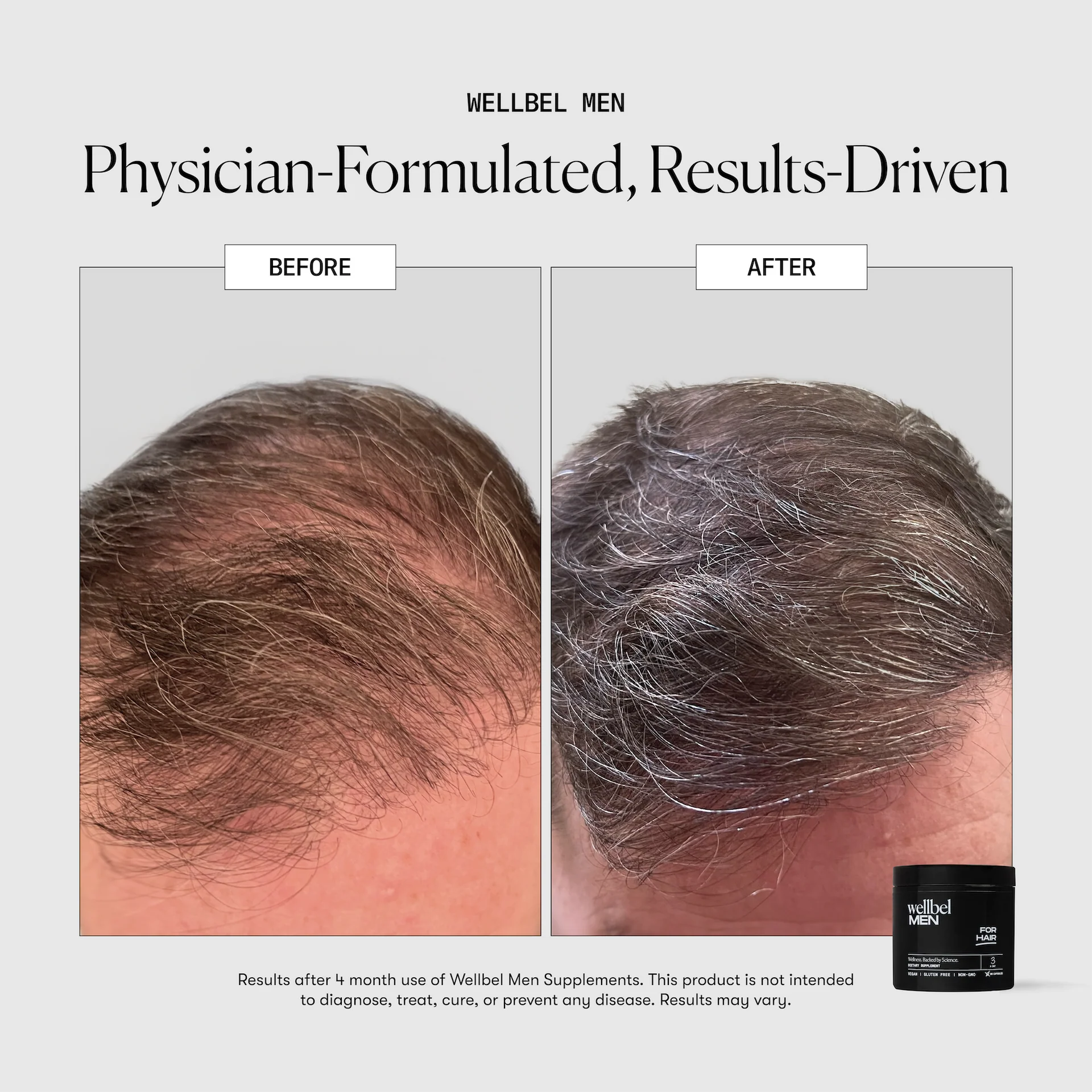 Wellbel Men is a physician-formulated daily supplement that naturally supports and maintains healthy hair growth and nourishes thinning hair. Wellbel Men's holistic approach to hair health offers vitamins, minerals, and botanical extracts that help optimize the appearance and overall health of your hair.